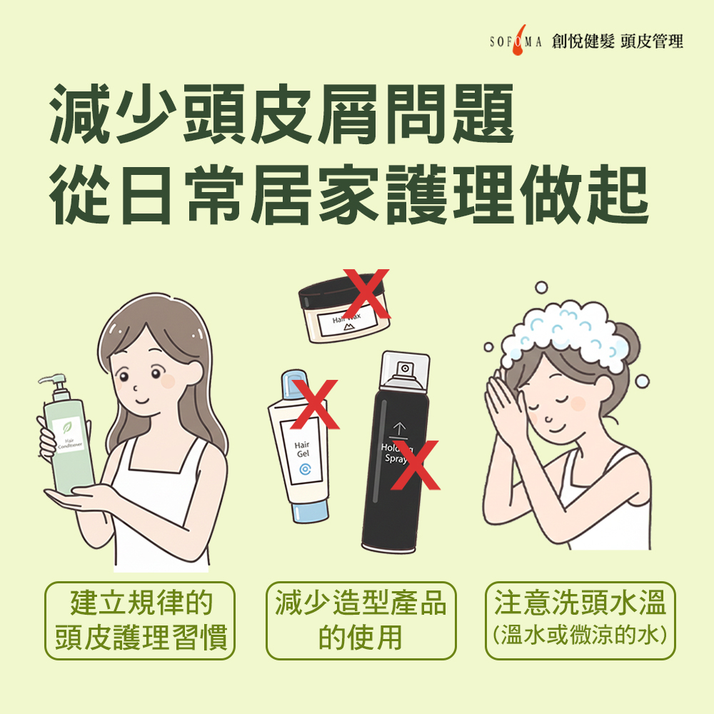 正確日常居家護理,也可以降低頭皮屑發生的頻率。